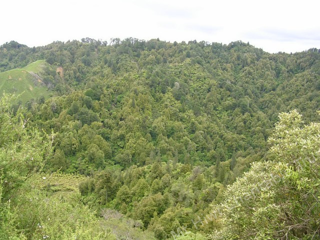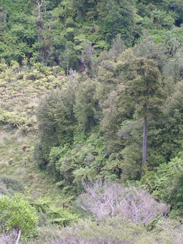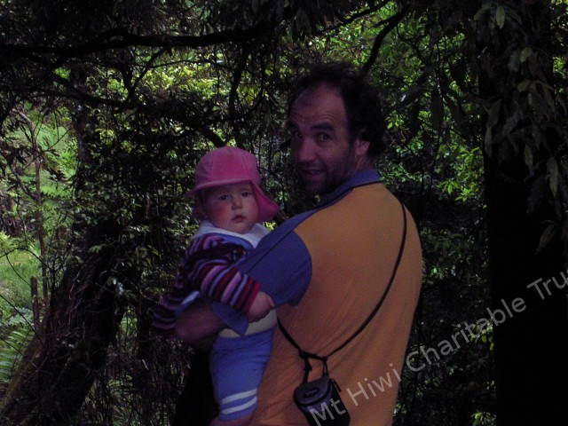 Pictures of the land. Left, Phil and his daughter. On the right, a one year old girl under a ?? year old tree - we think its a Matai or a Miro. |